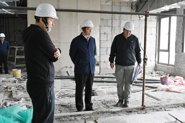 丛玉豪参观了在建中的研讨室、会议室、数字全息教室、客房、餐厅等建筑设施,深入了解临港国际校区工程建设进度,并就建设中的具体问题进行深入交流。