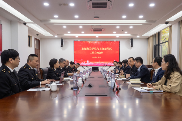 11月7日,中国—上海合作组织地方经贸合作示范区(简称 “上合示范区”)一行访问上海海关学院。青岛市委常委、上合示范区党工委书记、胶州市委书记张新竹、上海海关学院校长陈晖、副校长王晓刚参加座谈。